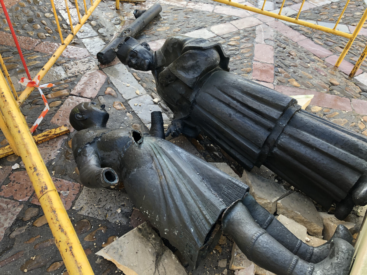 El conjunto escultórico, obra de José Luis Fernández, se trasladará al Centro de los Oficios para las reparaciones pertinentes, ya que se ha roto el hacha que porta en la mano uno de los síndicos y la peana que sostenía la pieza.