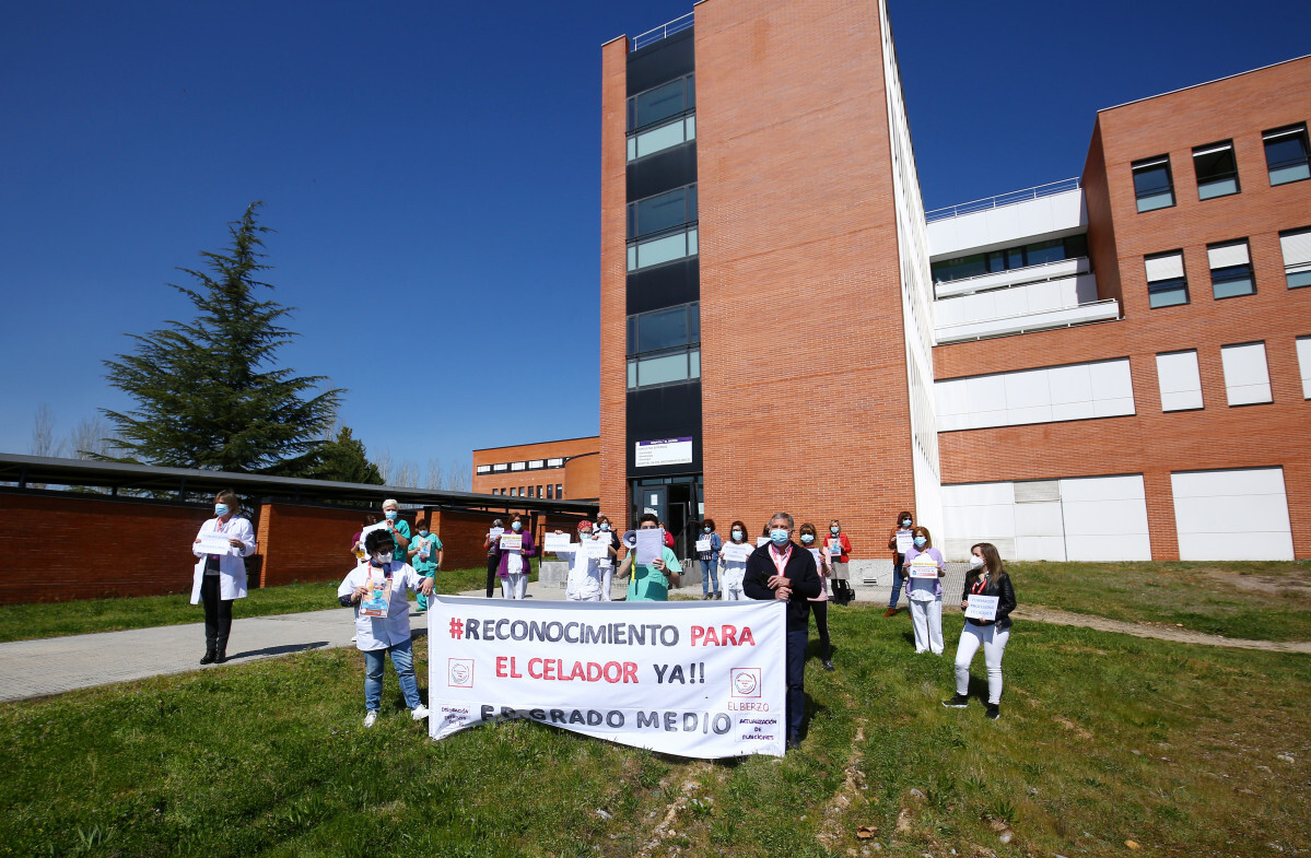 César Sánchez / ICAL . Concentración de la plataforma ‘Reconocimiento para el celador ya’ en el Hospital del Bierzo para reclamar la reforma del estatuto que regula la profesión