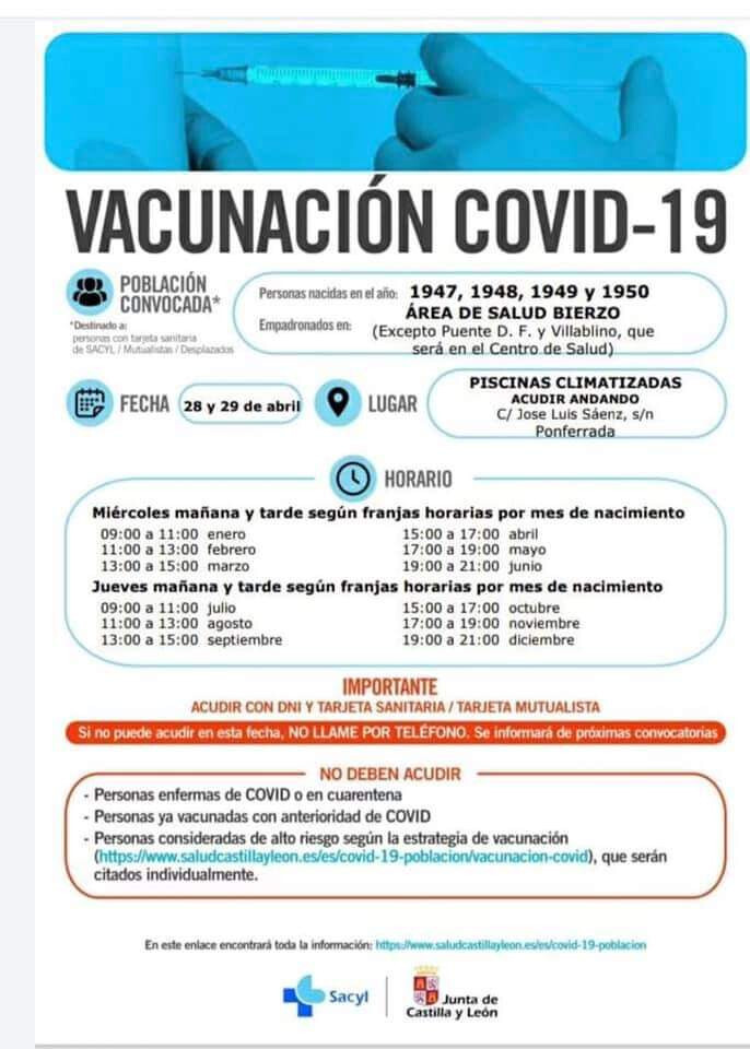 El llamamiento a la población de cara al proceso de vacunación de estos dos días afecta a las personas del Área de Salud del Bierzo nacidas en los años 1947, 1948, 1949 y 1950, con la excepción de las pertenecientes a Puente de Domingo Flórez y Villablino, que serán vacunadas en sus respectivos centros de salud. Se recomienda, en la medida de lo posible, acudir andando al lugar de la vacunación, para evitar aglomeraciones y atascos que podrían entorpecer el proceso.