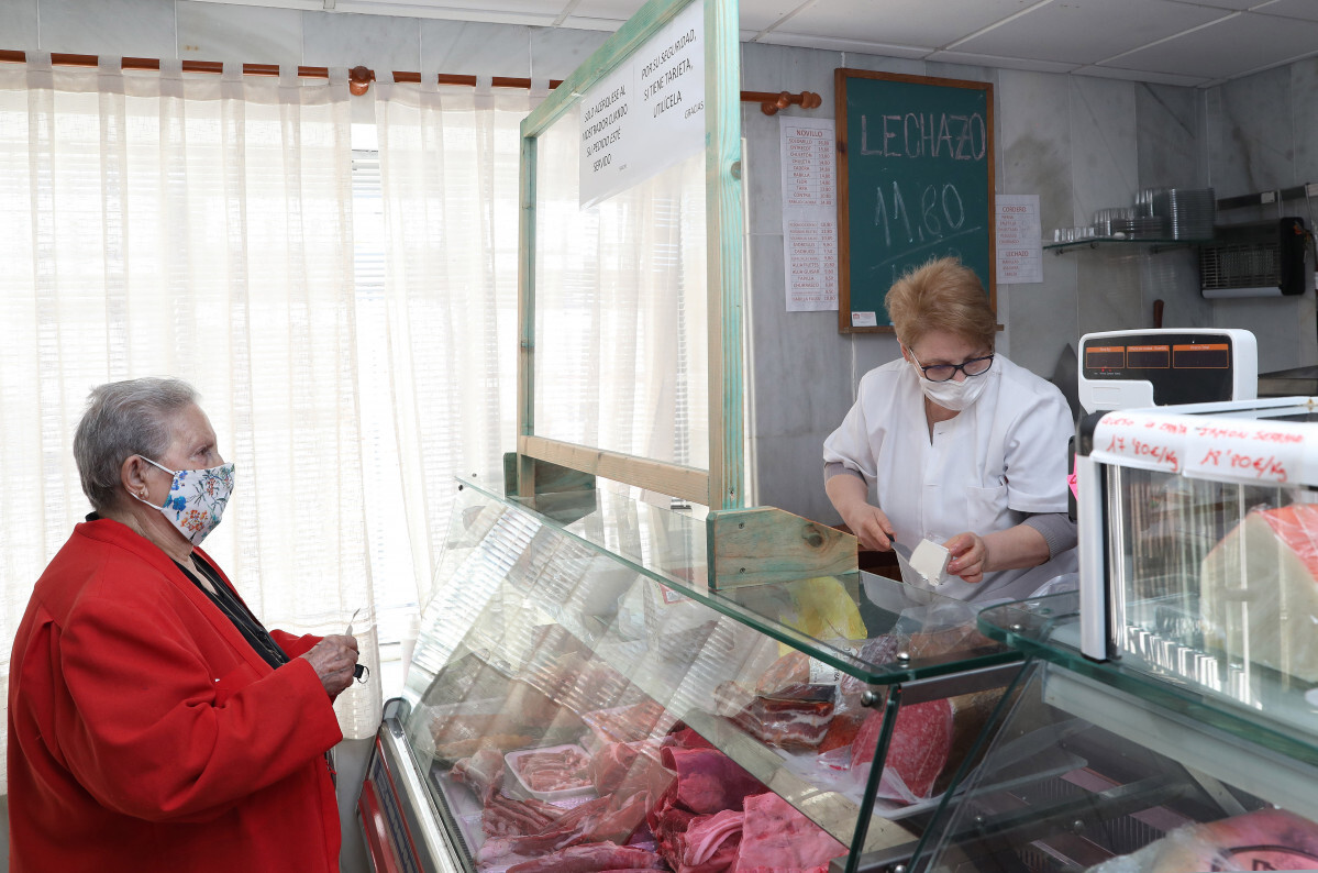 Vestida y aseada, Dolores está lista para acercarse a la carnicería, siempre bajo la sombra de Visitación. “Vengo a comprar queso blando, porque ya tengo jamón. El resto de la comida me la traen de la residencia”, asegura en declaraciones a la Agencia Ical.