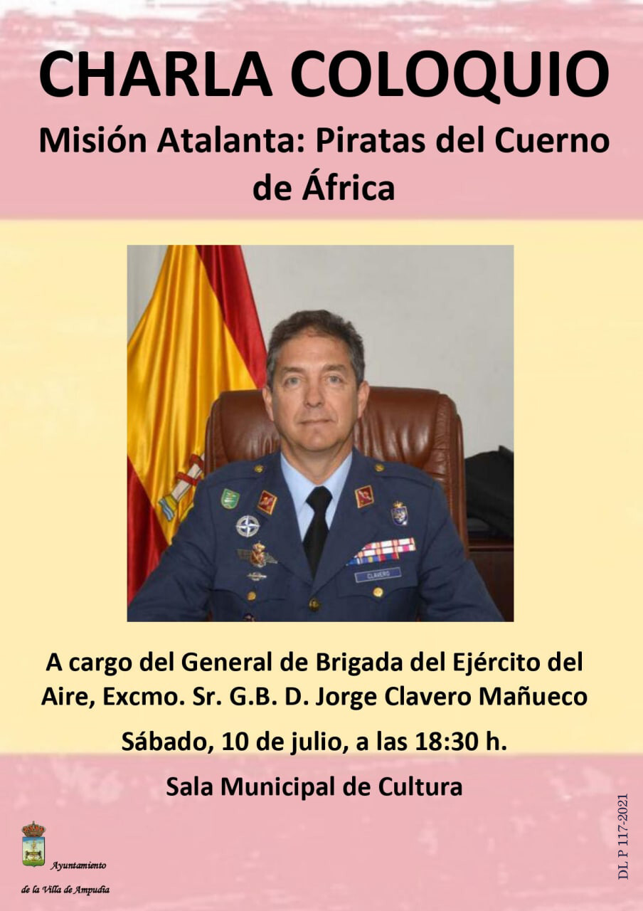 La localidad palentina de Ampudia celebrará este fin de semana una variada propuesta cultural en la que destaca la charla coloquio Misión Atalanta: Piratas del Cuerno de África, impartida por el General de Brigada del Ejército del Aire, Jorge Clavero Mañueco. El acto tendrá lugar en la sala de Cultura del Ayuntamiento del municipio, este sábado a las 18:30 horas.