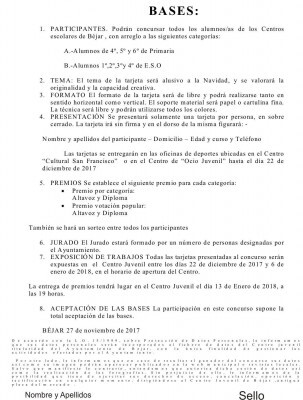 Las tarjetas, en sobre cerrado, se podrán entregar hasta el 22 de diciembre en el departamento de deportes del Ayuntamiento de Béjar (sito en CMC San Francisco) o en el Centro de “Ocio Juvenil” (Antiguo mercado).