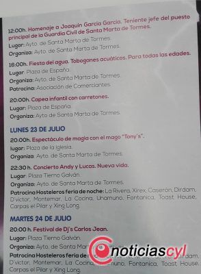Santa Marta de Tormes celebra ya sus fiestas patronales, que tendrán lugar hasta el 30 de julio, tras un preludio musical y religioso con las fiestas del barrio del Carmen. Este domingo, variada programación para todos los públicos, con el homenaje del Ayuntamiento a Joaquín García García, teniente jefe del puesto de la Guardia Civil que deja su cargo tras once años. Mientras, continúa la feria de artesanía en la plaza de la iglesia. Por la tarde, fiesta del agua y capea infantil con carretones.