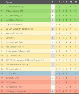 Unionistas de Salamanca se encuentra en mitad de la clasificación tras empatar contra el Atlético de Madrid B. No obstante, con cuatro puntos, está a tan sólo tres del líder, ahora la Ponferradina, pues el grupo está muy apretado. De hecho, en tres jornadas ha habido tres líderes diferentes.