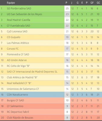 Tabla en cuya parte baja sigue el Salamanca UDS, antepenúltimo con nueve puntos tras perder en su visita al filial del Atlético de Madrid. Sólo está uno por encima de los colistas y a cinco de la salvación cuando está a punto de cumplirse un tercio de la temporada.