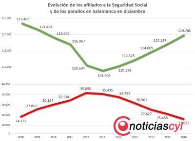 Esa contratación temporal se percibe en el número de afiliados a la Seguridad Social, que se situó en Salamanca en el mes de diciembre en las 119.785 personas, 117 que el mes anterior (un descenso mayor que el año pasado) pese a que la lista del paro bajó (en parte por la emigración a otras provincias), aunque son 2.667 afiliados más que hace un año, dato que se considera que marca la creación o no de empleo.