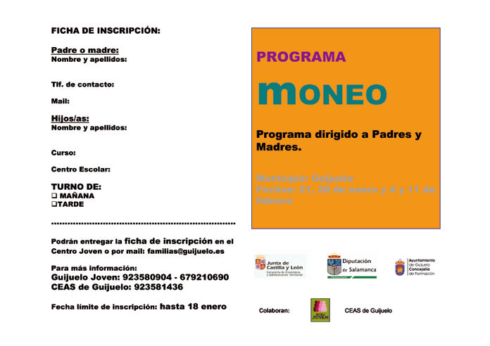 Con el objetivo de ampliar los contenidos de formación que se ofrecen a los progenitores de la Villa, Guijuelo Joven acogerá cuatro sesiones, el 21 y 28 de enero y el 4 y 11 de febrero, del Programa Moneo financiado por la Junta de Castilla y León, promovido por la Diputación de Salamanca y en el que colabora el Ayuntamiento de Guijuelo. El programa, que está especialmente dirigido a padres y madres de escolares de entre 5º de Primaria y 2º de la ESO, tiene como objetivo ofrecer a los padres herramientas eficientes para afrontar la preadolescencia y adolescencia. “Son unas sesiones muy especializadas para padres o abuelos de niños con edades comprendidas entre los 11 y los 14 años”, explicaba la concejala de Educación, Mª Teresa Montero Prado.
