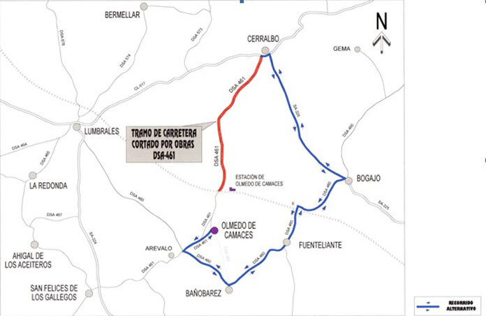 Con motivo de la ejecución de las obras de refuerzo del firme de la carretera DSA-461, en el tramo comprendido entre Cerralbo y la Estación de Olmedo de Camaces, promovidas por la Diputación de Salamanca dentro de los planes de inversión de carreteras, dicho tramo de carretera permanecerá cerrado al tráfico de vehículos del 23 de enero al 8 de junio.