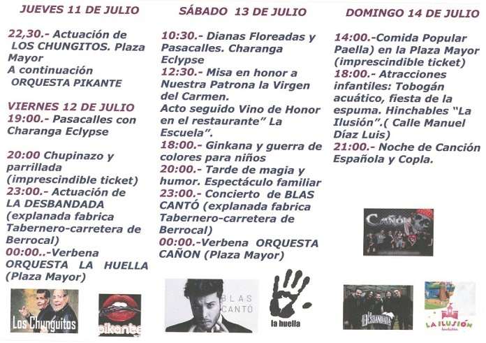Campillo de Salvatierra celebrará sus Fiestas en honor a la Virgen del Carmen desde el jueves 11 al domingo 14 de julio. Estas serán las primeras Fiestas como alcalde de Juan Carlos Tejedor.
