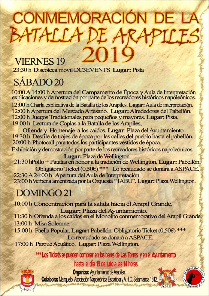 Este sábado estará disponible durante toda la jornada un campamento de época y el aula de interpretación, donde a mediodía habrá una charla explicativa sobre la Batalla. Por la tarde, la Asociación Cultural y Deportiva Batalla de Arapiles protagonizará un desfile de trajes de época por las calles del municipio, dando paso después a una demostración histórica, cena popular con con pollo con patatas. El domingo será el turno para la ofrenda a los caídos durante la batalla, a las 11:30 horas en el Arapil Grande.