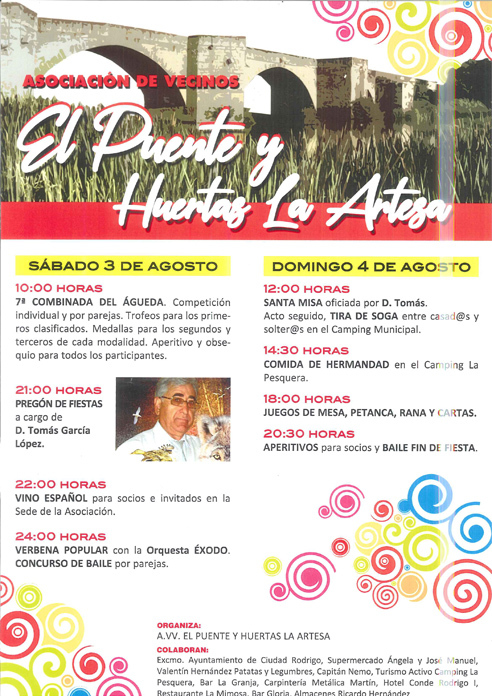 La Asociación de Vecinos El Puente y Huertas La Artesa celebran este fin de semana sus fiestas patronales que tienen su plato fuerte, el domingo, con la misa y la procesión. Antes, habrá un pregón a cargo de Tomás García López, el sábado, que cierra la jornada sabatina con la verbena a cargo de la orquesta Éxodo.