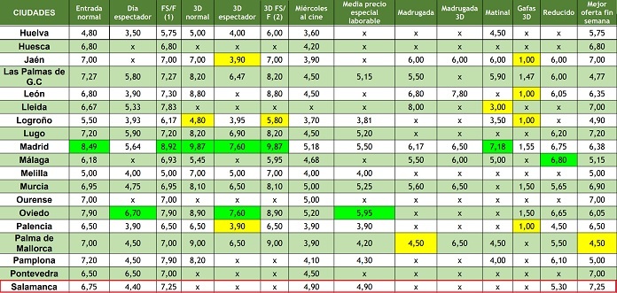 Madrid, Barcelona y Guadalajara son de nuevo las tres capitales de provincia más caras para ir al cine los fines de semana y festivos, si se recogen sus precios sin aplicar ningún tipo de descuento u oferta. Las diferencias llegan a alcanzar el 130% en el caso de los precios de días laborables.