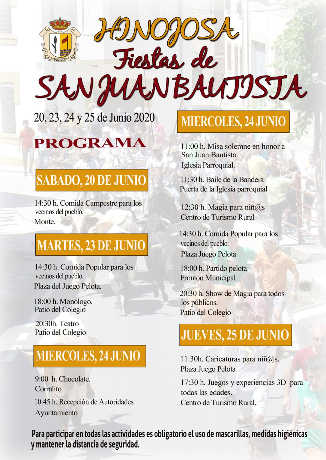 Las actividades comienzan, como es tradicional, con una comida en el Monte para los vecinos del pueblo, el sábado, 20 de junio. A partir del 23, cuando tendría que celebrarse el pregón, serán una comida popular para los vecinos, teatro y magia -actividades para estar sentados en el patio del colegio-. Esta tónica de actividades siguen el 24, cuando la misa y el Baile de la Bandera, pero sin procesión-, y el 25 con más actividades culturales.