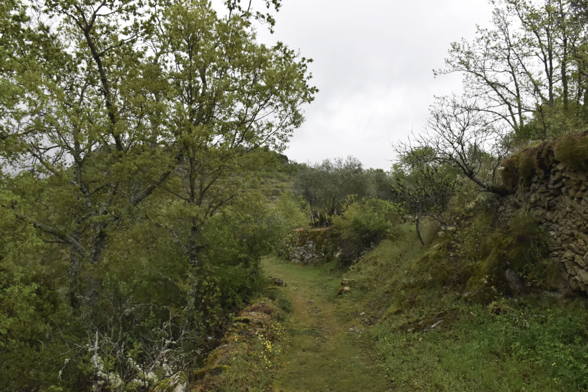 La senda es agradable por su pequeño desnivel, pero tiene curiosidad la ingente cantidad de líquenes y monte bajo que se han apoderado de cantidad de predios y cortinas donde crece salvaje el zumaque y el zarzal. En esta inmensidad del silencio se escucha el cantar de una abubilla. A la izquierda del sendero se erige la inmensa roca de El Cuernito, que se asienta en bancales rectilíneos donde crecen, casi olvidados, el almendro, el olivo y también alguna cepa. Un chozo bien conservado da cuenta de lo que estos terrenos de cultivo fueron antaño.