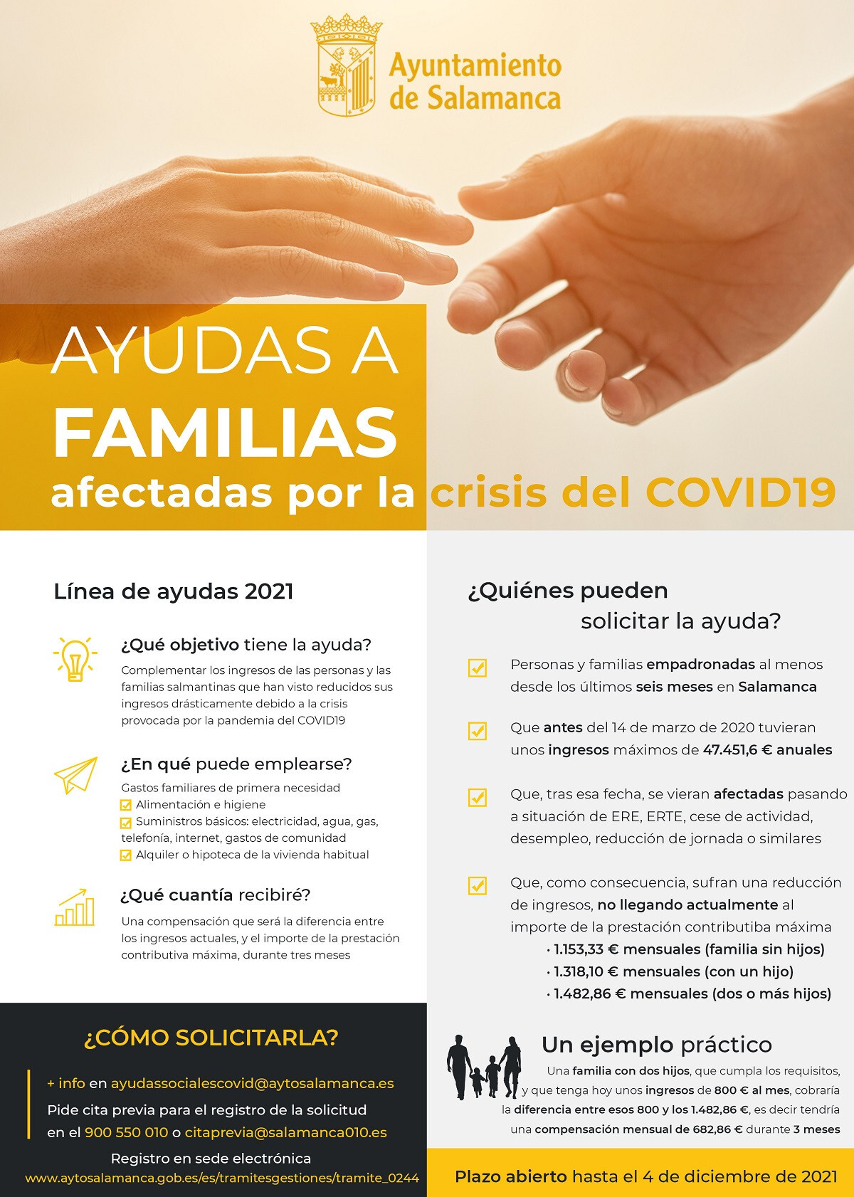 El Ayuntamiento de Salamanca, a través de la Concejalía de Familia e Igualdad de Oportunidades que representa Ana Suárez Otero, ha anunciado la apertura del plazo para solicitar las ayudas económicas ante situaciones de urgencia social por causas de fuerza mayor sobrevenidas, como el COVID-19. Estas ayudas, incorporadas al “Reglamento regulador de la prestación económica destinada a la atención de necesidades básicas de subsistencia en situaciones de urgencia social” tras un proceso participativo en el que se estableció un sistema para poder afrontar las necesidades económicas derivadas de situaciones de emergencia sobrevenidas, parten con un presupuesto inicial de 2 millones de euros.
