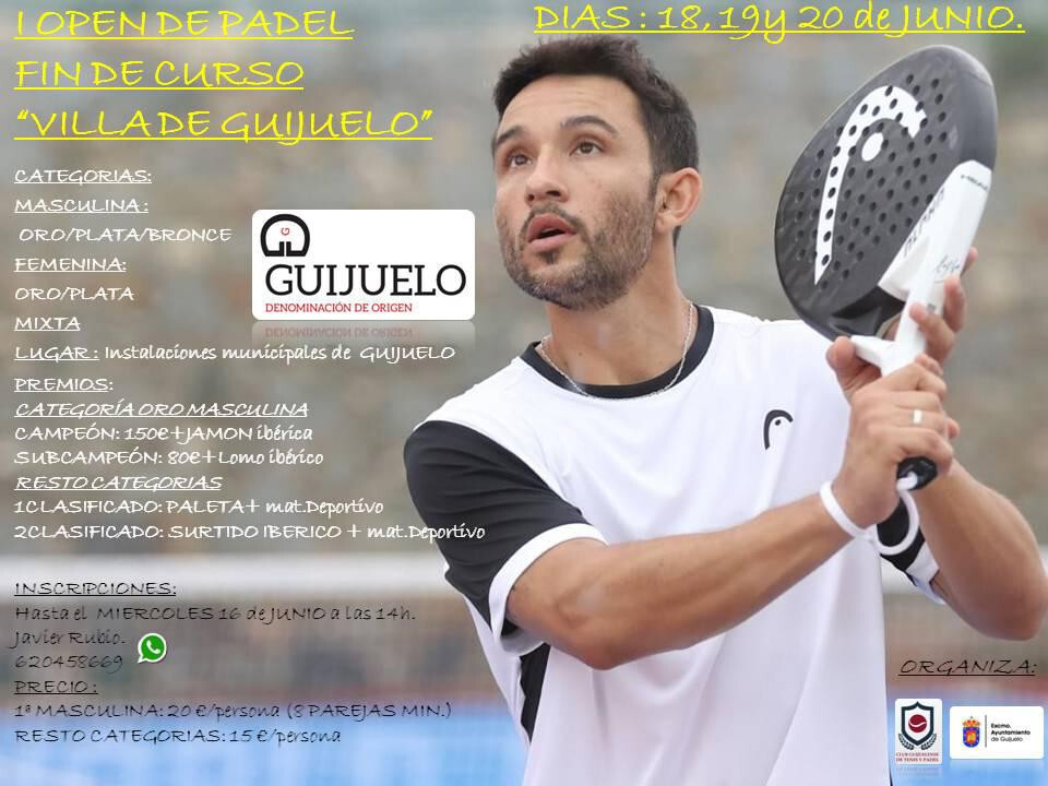 Por un lado, el I Open de pádel ‘Fin de curso’, que se celebrará los días 18, 19 y 20 de junio, contará con categorías: oro, plata y bronce en masculino y oro y plata para la categoría femenina, además de una cuadro único para el mixto. Los interesados pueden apuntarse antes del 16 de junio, en el teléfono 620 458 669. El precio de la inscripción es de 20 euros por persona en oro masculina y de 15 euros para el resto de categorías.
