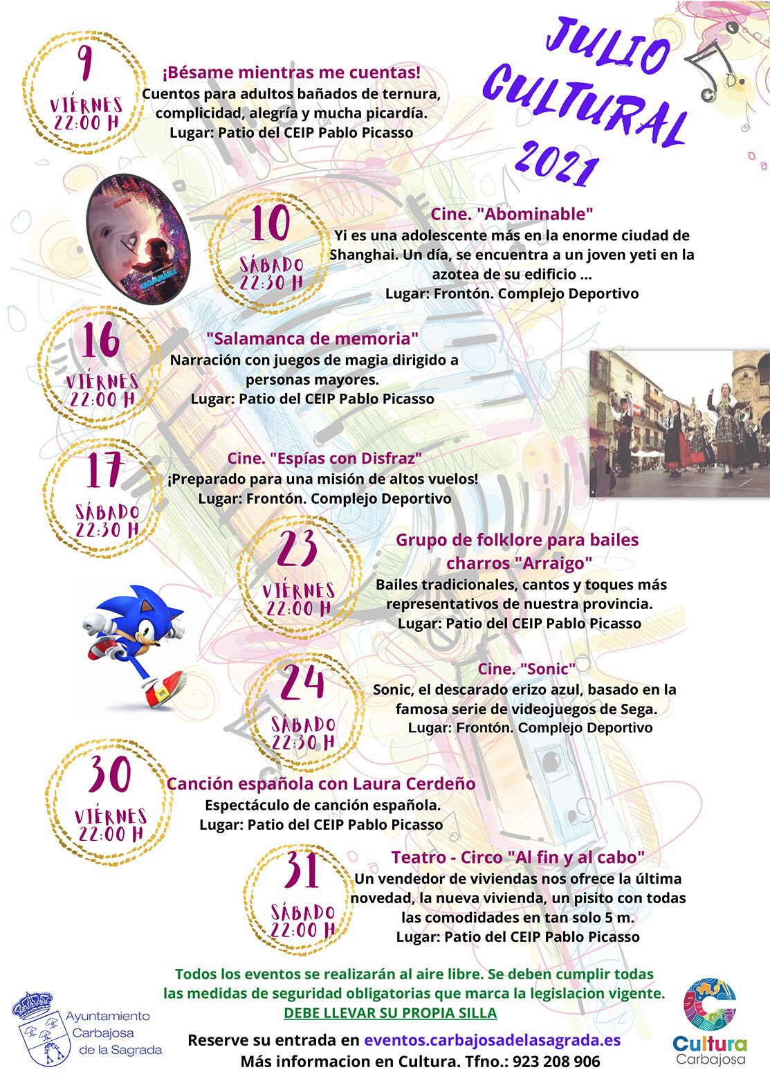 Los viernes, a las 22,00 horas en el patio del Colegio Pablo Picasso, se celebrarán actividades dirigidas especialmente para los más mayores, aunque la concejala de Cultura, Teresa Sánchez, ha explicado que es un programa abierto a la participación de todos los vecinos. Los sábados será día de cine familiar y tendrá lugar a las 22,30 horas en el frontón del Complejo Deportivo. Julio Cultural se despedirá el sábado 31 de julio con teatro y circo.