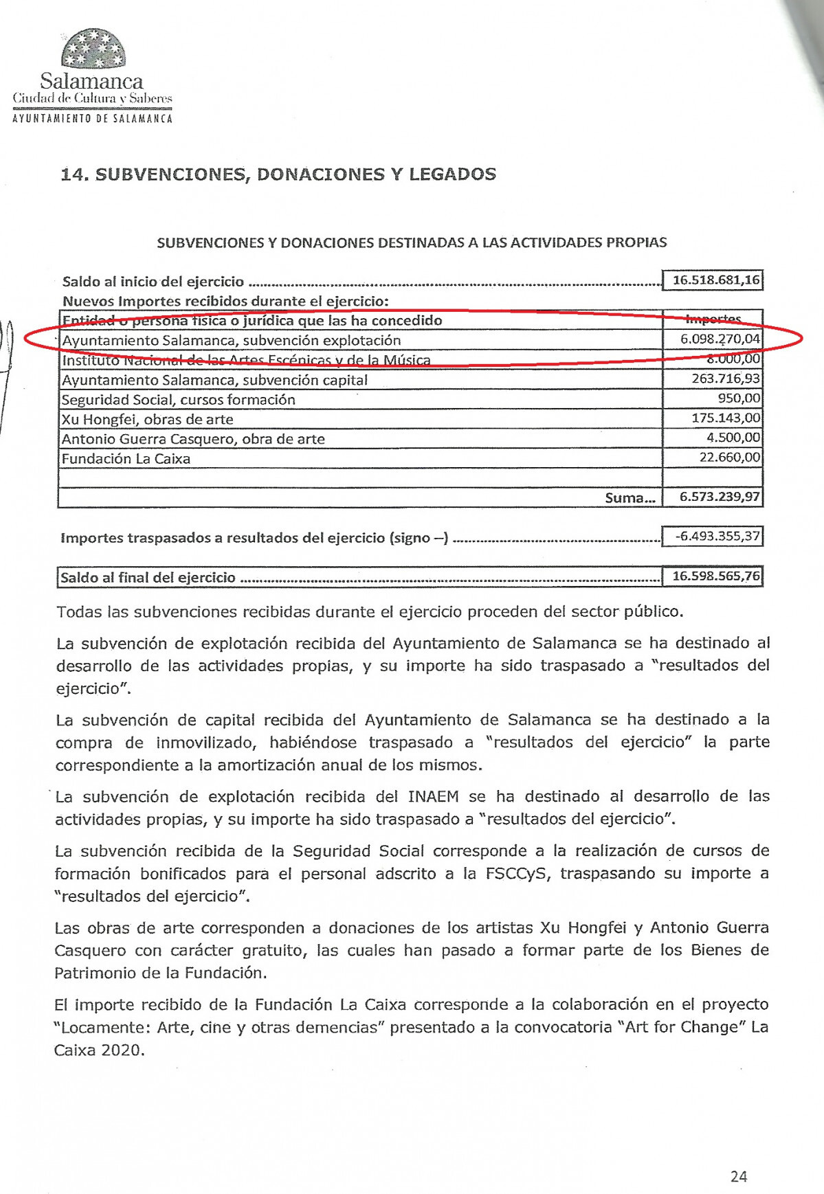 Son muchas las voces, no solo políticas, las consultadas por este diario que consideran a la Fundación como "una empresa pública destinada exclusivamente a la contratación". La principal fuente de ingresos (como refleja el documento adjunto), procede del Ayuntamiento de Salamanca, que aporta 6.098.270 euros, más otros 263.716 euros a modo de subvención capital, y sin embargo, la gestión se sale fuera del control municipal.