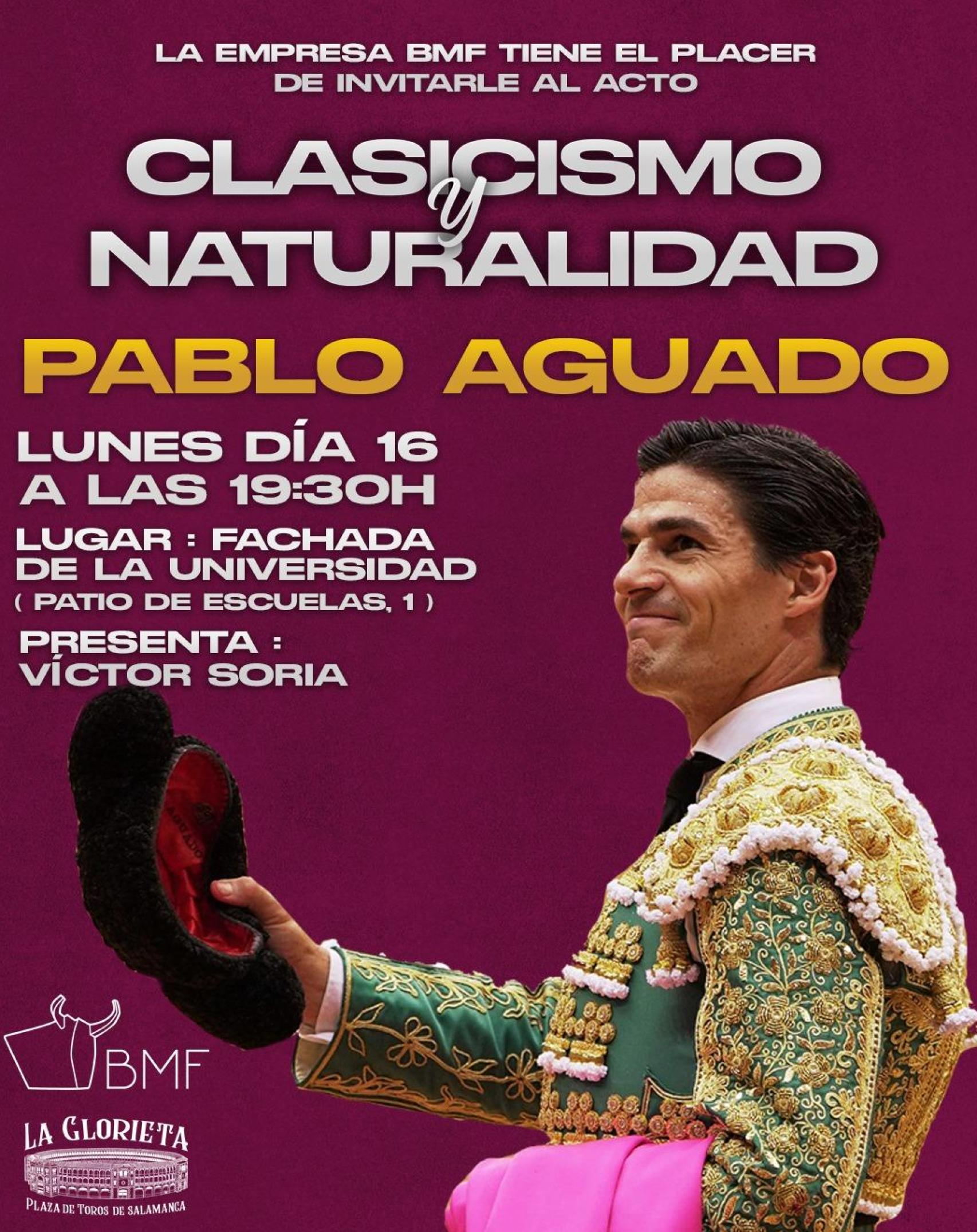 En el evento, Pablo Aguado compartirá coloquio y escenario con el periodista salmantino Víctor Soria. El acto se celebrará a partir de las 19.30 horas en la Fachada de la Universidad (Patio de Escuelas, 1) y estará abierto al público y a todos aquellos aficionados que deseen asistir.