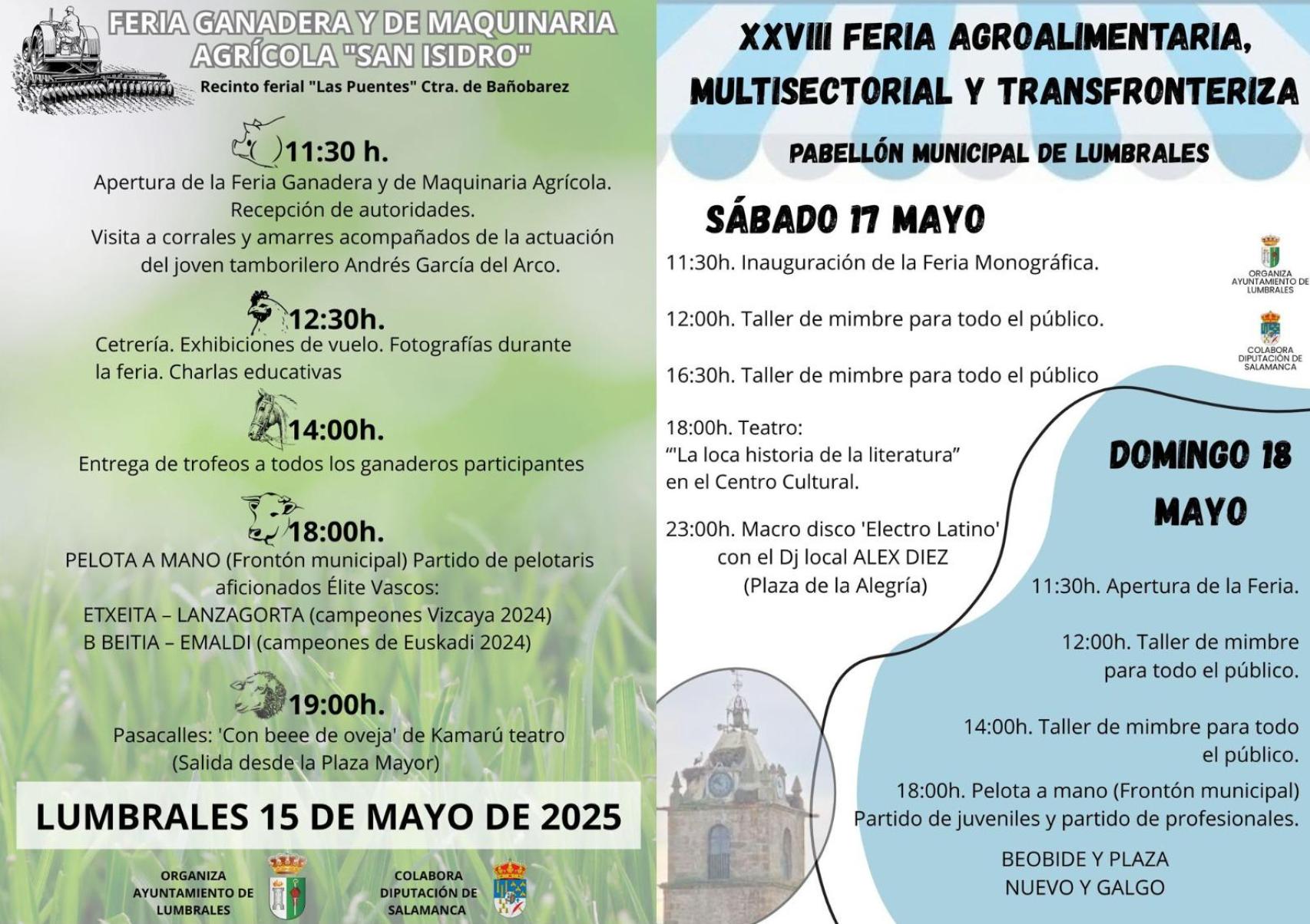 El Ayuntamiento de Lumbrales organiza una nueva edición de la tradicional Feria Ganadera y Maquinaria Agrícola 'San Isidro', el jueves 15 de mayo. El evento tendrá lugar, como de costumbre, en el recinto ferial 'Las Puentes', en la carretera de Bañobárez. Por su parte, la XXVIII Feria Agroalimentaria, Multisectorial y Transfronteriza se celebrará en la plaza de la Alegría, los días 17 y 18 de mayo, sábado y domingo respectivamente.