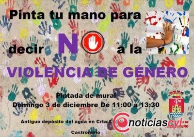 Durante la mañana del domingo 3 de diciembre, los vecinos de Castronuño podrán colaborar pintando su mano en una de las paredes del antiguo depósito del agua, situado en la Crta/ Alaejos-Toro. Con este gesto simbólico se pretende lanzar un mensaje contundente para erradicar la violencia contra las mujeres. El lema que presidirá el mural es: “Contra la violencia machista todas las manos son necesarias”, frase de cuya lectura se concluye que todos y todas debemos involucrarnos ante cualquier caso que conozcamos de violencia de género.