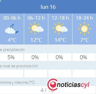 Las temperaturas oscilarán entre los 4 y los 16 grados, mientras que la probabilidad de lluvia será del 5% desde las 00:00 a las 06:00 horas bajando al 0% el resto del día.