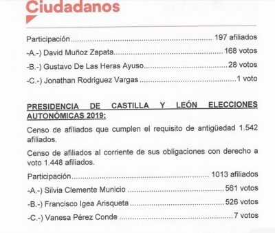 En el documento de Ciudadanos en el que se refleja el acta de la votación, con el resumen de las cifras de participación y el reparto de los votos, se aprecia una discordancia entre la participación, 1.013 afiliados, y los votos asignados a cada candidato, 561 para Clemente, 526 para Igea y 7 para Vanesa Pérez; es decir, 1.094 en total.