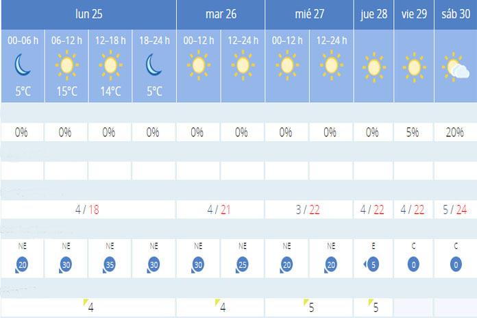 La AEMET augura una semana de temperaturas sumamente apacibles sin lluvias y con los cielos despejados. Para este lunes las mínimas estarán en los 4º y las máximas se irán a los 18º experimentándose un cambio el martes con un ascenso de las máximas hasta los 21º.