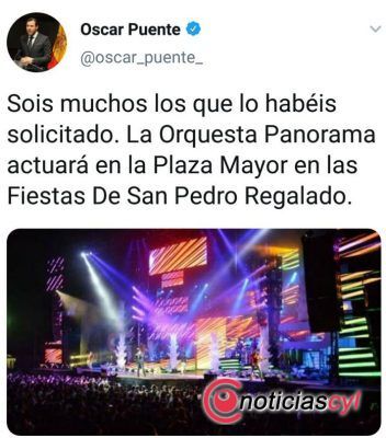 El alcalde de Valladolid, Óscar Puente, ha anunciado a través de su cuenta personal de Twitter que la Orquesta Panorama actuará en la Plaza Mayor con motivo de las Fiestas de San Pedro Regalado, que se celebran el 13 de mayo.