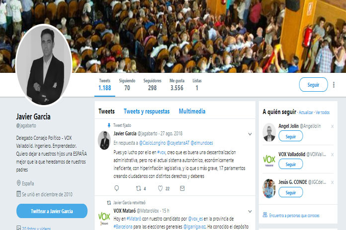 Javier García, ingeniero industrial por la UVA y que trabaja en una empresa de automoción, es actualmente vicesecretario del Consejo Político de VOX Valladolid y vocal del Comité Ejecutivo Provincial.