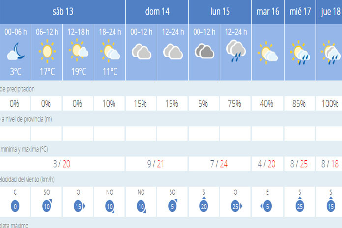 Este sábado y el Domingo de Ramos parece que el agua respetará pero será a partir del lunes cuando la cosa se empezará a poner complicada. Ese día, las probabilidades de lluvia son del 75% en la capital mientras que para el Miércoles y Jueves Santo son del 85% y del 100% respectivamente.
