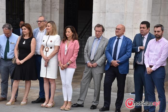 Todos los concejales del Ayuntamiento de Valladolid, tras concluir la sesión del pleno ordinario del mes de julio, se han concentrado a las puertas del Consistorio para mostrar en un minuto de silencio el rechazo y repulsa ante el último caso de violencia de género en Salas de los Infantes, Burgos, donde un hombre de 39 años ha matado con un arma blanca a su pareja, Monika A, de 28 años, y después se ha entregado y confesado los hechos.