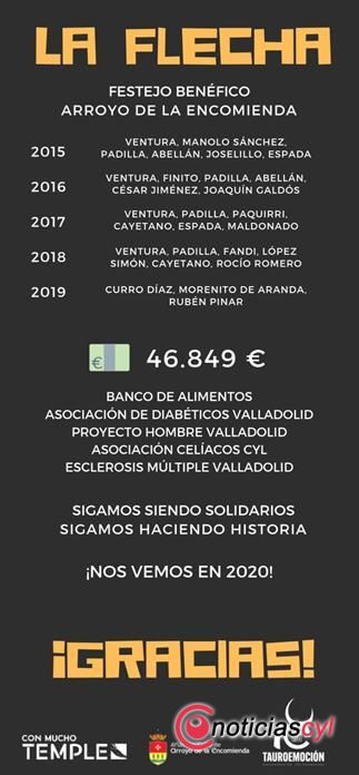 El mundo del toro, a pesar de los pesares, sigue siendo generoso y solidario cuando se le brinda la oportunidad. Lo demuestra el hecho en La Flecha (Valladolid) desde que Nacho de la Viuda (gerente de Mucho Temple y Tauroemoción) iniciara la aventura -porque fue una aventura conociendo el coso de la localidad- de organizar festivales taurinos en beneficio de diversas causas (Banco de Alimentos y Asociación de Esclerosis Múltiples, ambas de Valladolid, etc.