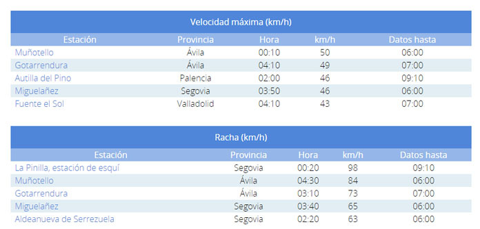 Muñotello, en Ávila, ha registrado la velocidad máxima del viento con 50 kilómetros por hora, seguida de Gotarrendura, también en Ávila con 49 km/h y Autill del Pino, en Palencia, con 46 km/h.