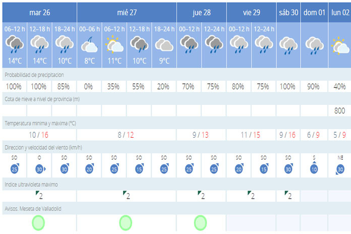 Valladolid se libra de la alerta pero no de la lluvia que estará presente a lo largo de todo el día. Las temperaturas oscilarán entre los 10º de mínima y los 16º de máxima en esta jornada de martes en la capital del Pisuerga.