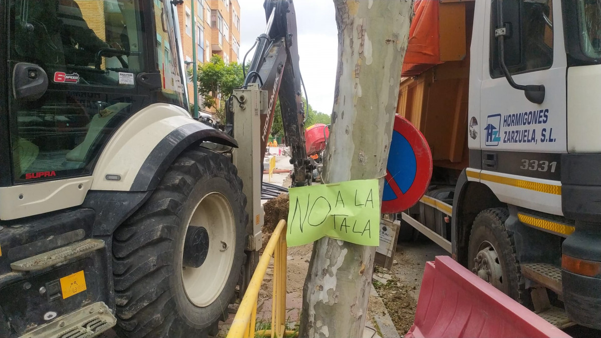 El barrio de la Rondilla continúa con sus reivindicaciones tras las obras del carril bici en la calle Mirabel que han obligado a talar los árboles ubicados allí hace décadas. En las últimas horas, los vecinos han pegado carteles en la zona en obras mostrando su rechazo con mensajes de "Dejad a los árboles en paz" o "No a la tala".