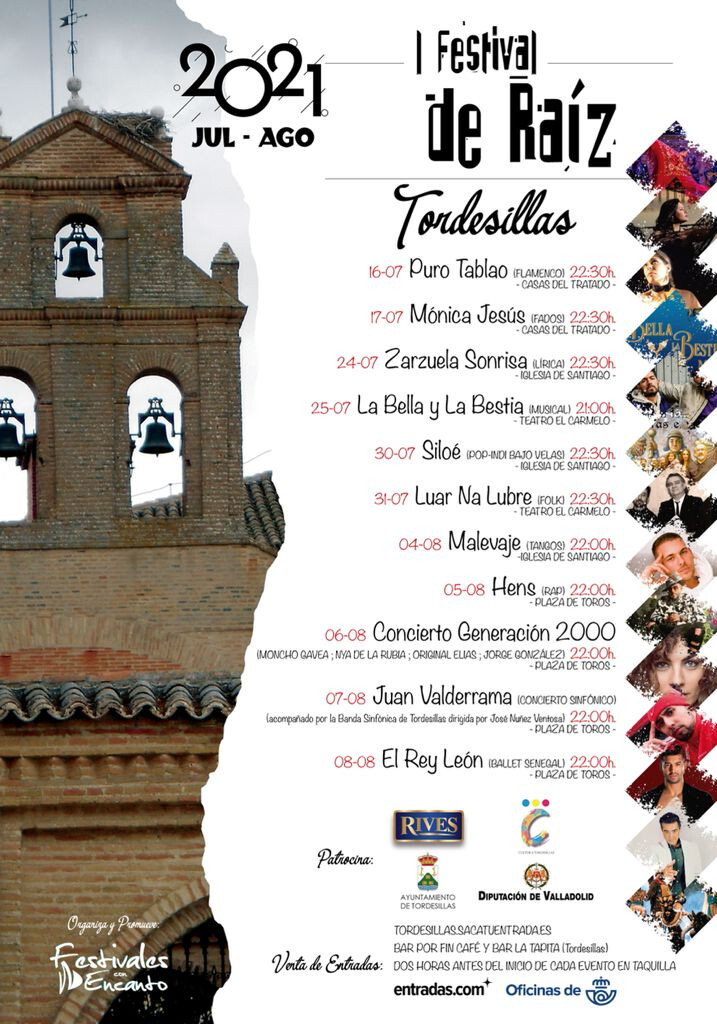 Tordesillas sube el telón de las actuaciones musicales para este verano de 2021 con el I Festival de Raíz. Una apuesta de la concejalía de Cultura del Ayuntamiento de Tordesillas y la Diputación de Valladolid y promovido por Festivales con Encanto. Esta apuesta por la cultura en tiempos de pandemia se verá reflejada con un cartel de hasta once actuaciones para todos los públicos y repartidas entre los meses de julio y agosto. Para ello se han buscado distintos emplazamientos de la villa como la Plaza de Toros, la Iglesia de Santiago, el teatro El Carmelo o las Casas del Tratado.