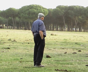 En una de nuestras visitas al Raso de Portillo, compartimos un buen rato con el veterano y sabio mayoral de la ganadería, recorriendo los cercados donde pastan los santacolomas, de procedencia Dionisio Rodríguez. Hablamos también con los ganaderos, que en unos días lidiarán en Castilla y León y en Francia.