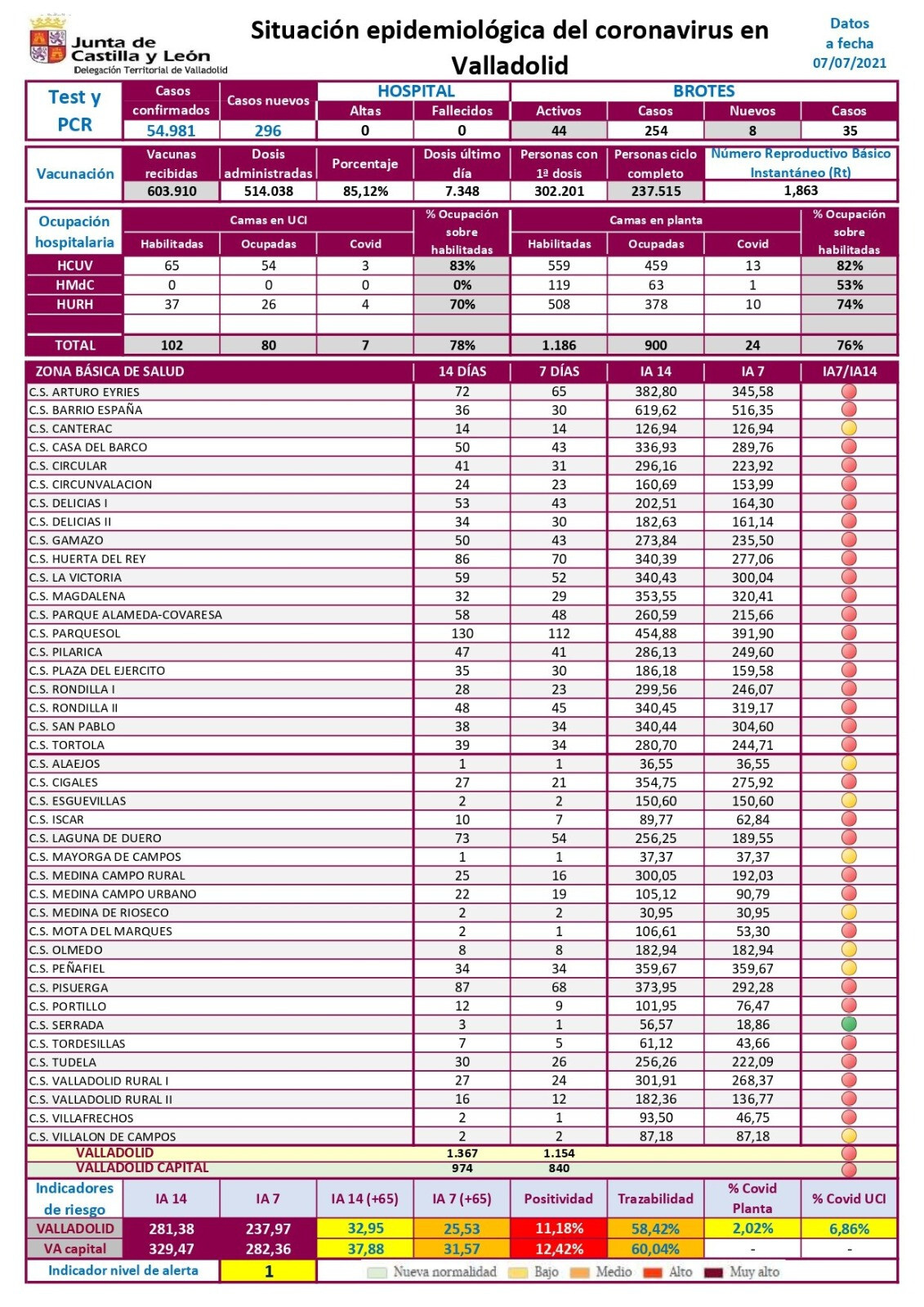 El pasado 29 de junio la incidencia acumulada en la provincia de Valladolid a la semana se ubicaba en los 42 casos. Atendiendo al semáforo epidemiológico, la Junta de Castilla y León informaba este martes de que los casos en los últimos 7 días y por cada 100.000 habitantes han subido hasta los 237 y la provincia se encuentra ya en riesgo “muy alto” por ello.