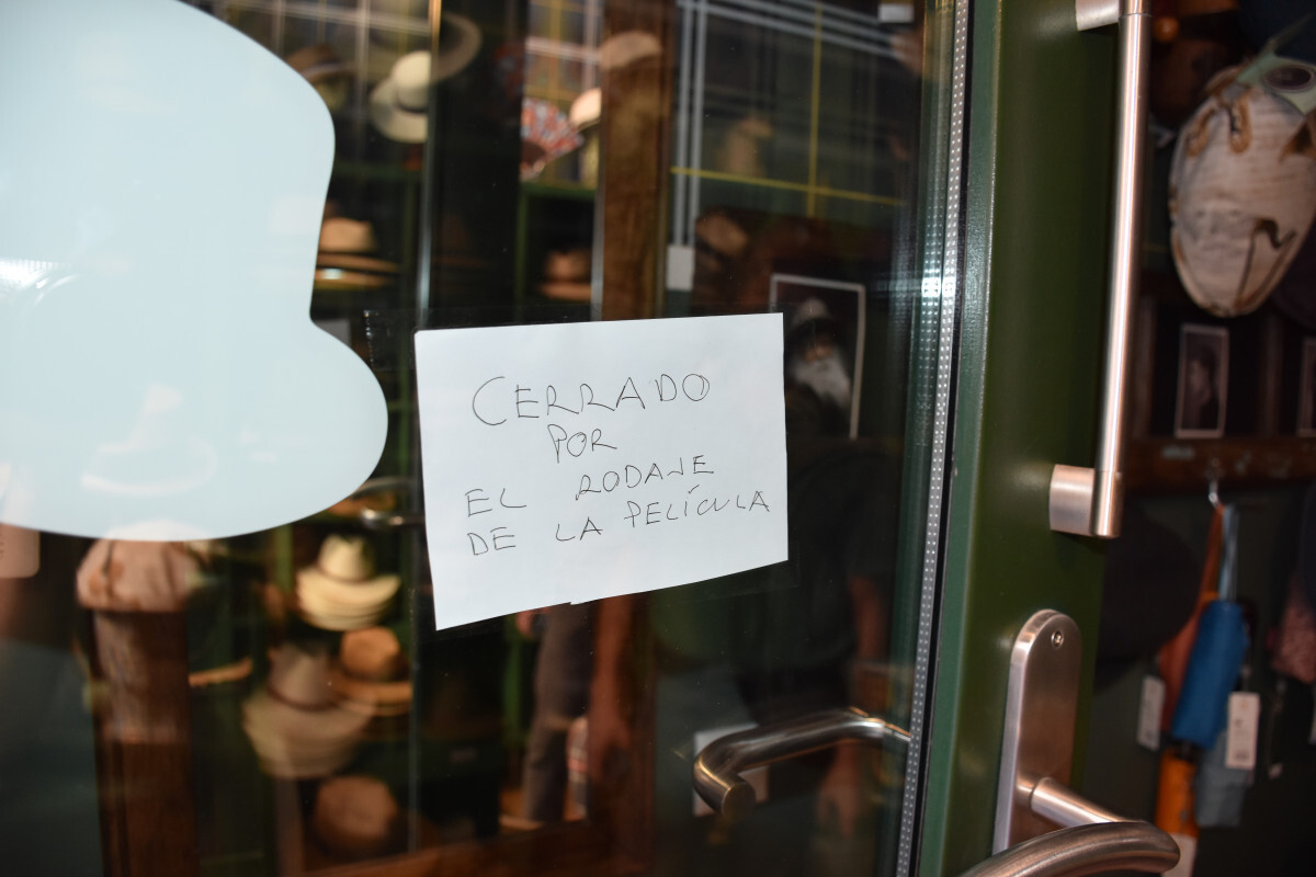 Engalanado con su sombrero de ala corta procede a cerrar, tras resoplar, una vez más, mientras, de fondo se escuchan las indicaciones de la dirección para organizar a los bailarines, y dejar un cartel tan breve como explícito: “Cerrado por el rodaje de la película”.