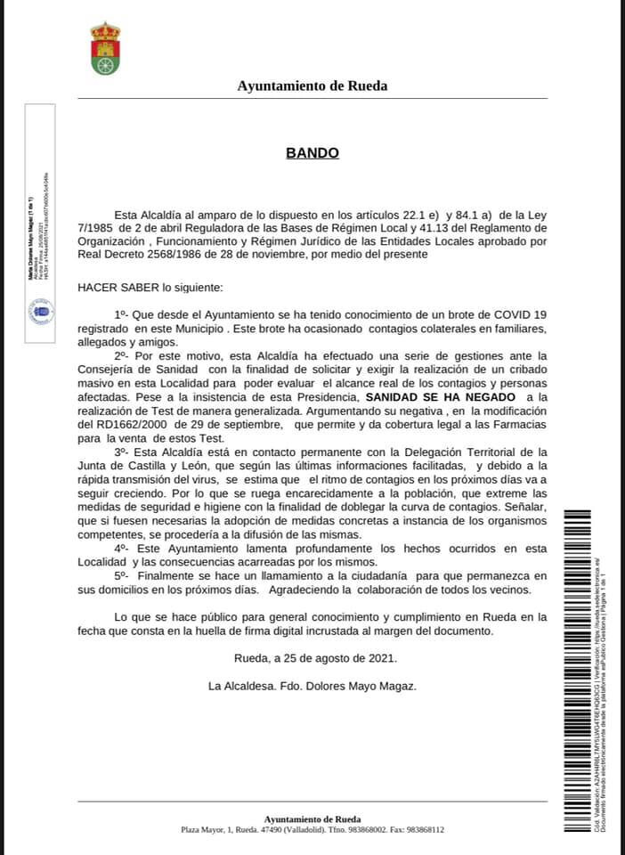 El Ayuntamiento de la localidad vallisoletana ha emitido, este miércoles, un bando municipal que lleva la firma de la alcaldesa en el que se asegura que la alcaldía “ha efectuado una serie de gestiones ante la Consejería de Sanidad con la finalidad de exigir la realización de un cribado masivo en la localidad” para “evaluar el alcance real de los contagios y las personas afectadas”.