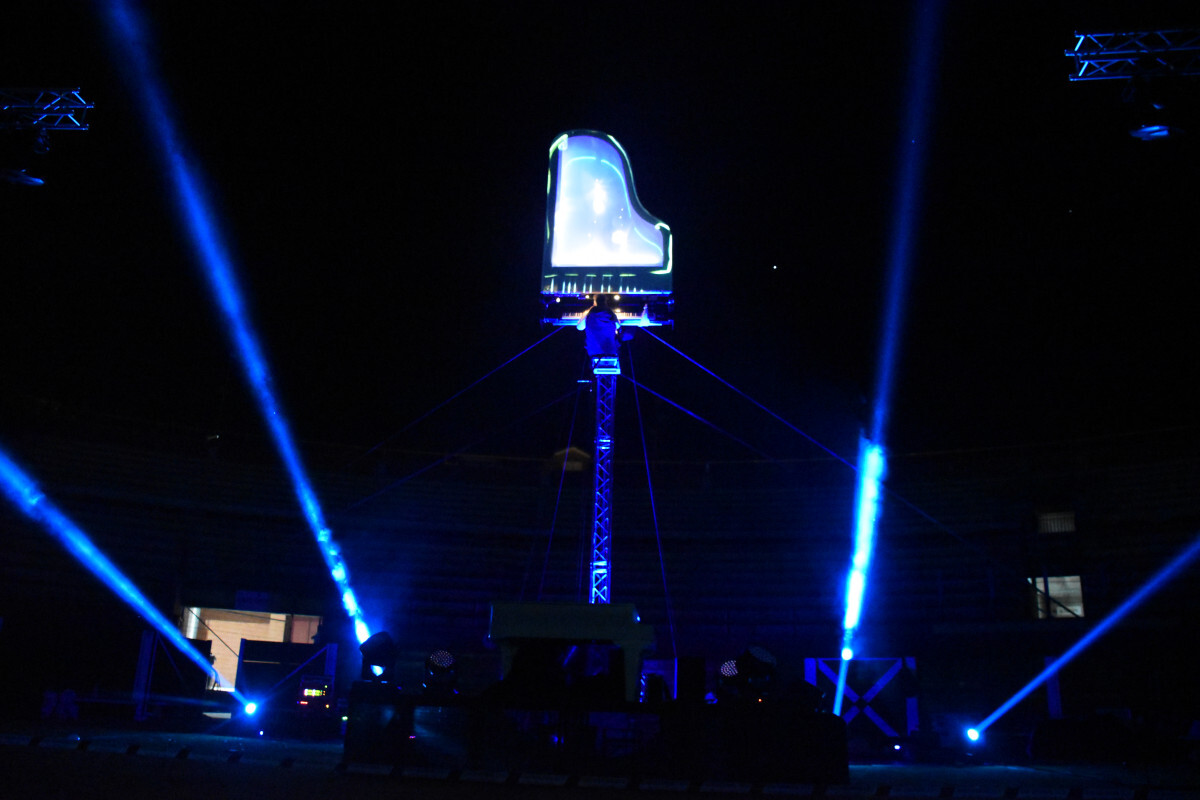 La puesta en escena de 'Flotados' obra de David Moreno y Cristina Calleja, hizo viajar, sin moverse del sitio a los asistentes a un universo único donde el arte, la música, la danza y el circo llenaron de emoción las localidades del albero y de las gradas. El público quedó embelesado con esta propuesta cultural que mezclaba novedosa tecnología audiovisual con la tradición de un instrumento tan hermoso como el piano.