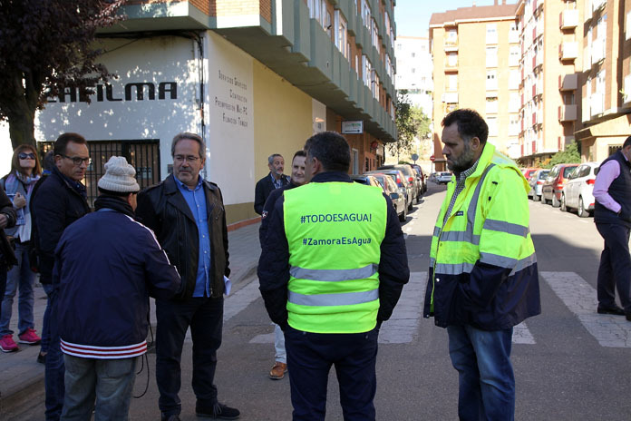 El alcalde, Francisco Guarido, y el concejal de Obras, Romualdo Fernández, han visitado hoy la zona coincidiendo con el restablecimiento de las conexiones a la red general de la calle de Villalpando, junto con el gerente AQUONA, Nicolás Esmoriz, que además de concesionaria del servicio de abastecimiento de guas es la empresa que ha ejecutado las obras. Hasta ahora y durante la ejecución de los trabajos se ha mantenido una conexión provisional con tubos de poliuretano flexible, con el objetivo de que los vecinos no sufrieran el corte del suministro. Ahora solo queda el cubrimiento y hormigonado de algunas zanjas y la extensión de la capa superficial de asfaltado en los tramos afectados, para igualar el pavimento anterior. No obstante la previsión es que a última hora de mañana, coincidiendo con el inicio de este largo fin de semana, se pueda restablecer el tráfico con normalidad en la calle de Villalpando, que ha estado cortada durante la ejecución de las obras.