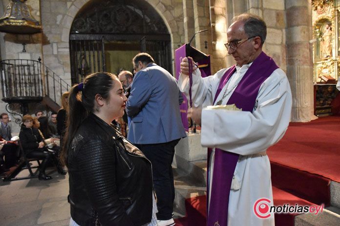 La iglesia de San Juan de Puerta Nueva ha vuelto a acoger el primer acto de imposición de medallones a los nuevos hermanos de la Cofradía, en este caso, a las nuevas damas que acompañarán el Sábado Santo a la Virgen de La Soledad de riguroso luto.