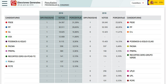 Por la derecha, el PP sufre un descalabro histórico, con una dolorosa sangría de 20.000 votos, lo que le ha hecho perder un diputado nacional en favor de Ciudadanos, que gana más de 6.000 votos en los últimos comicios. Vox, aunque no ha logrado representación parlamentaria, ha irrumpido en las urnas de la provincia con casi 13.000 votos, con los que presumiblemente ha restado oxígeno al PP que ve cómo la fragmentación de la derecha acaba con el monopolio popular como referente del voto conservador.