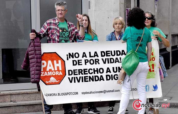La Plataforma de Afectados por la Hipoteca de Zamora protagonizaba esta mañana una protesta, a las puertas de banco BBVA de la plaza de la Constitución, a causa del previsible desahucio que la entidad acometerá contra una pareja de ancianos y el hijo que les cuida de la ciudad.
