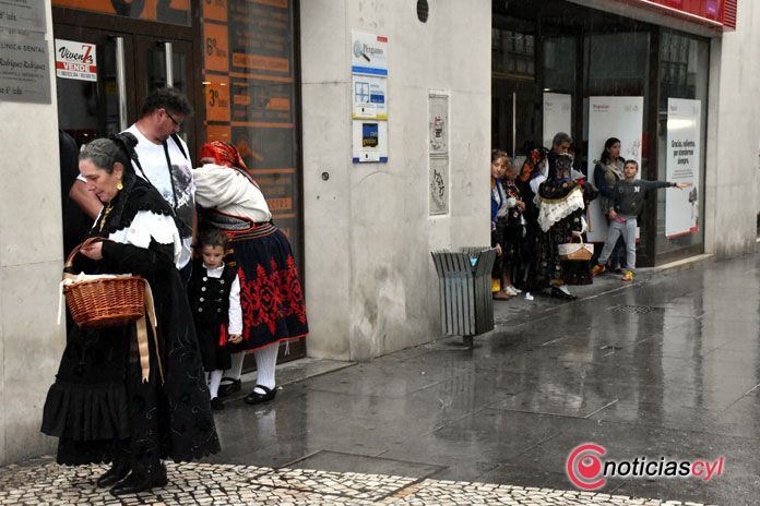 Un torrente de agua ha comenzado a caer poco después de las 18:30 horas impidiendo que participantes y colectivos ataviados con la indumentaria popular propia de las comarcas zamoranas hayan podido desfilar por la ciudad hasta la Catedral para asistir a la ‘Misa Tradicional Zamorana’.