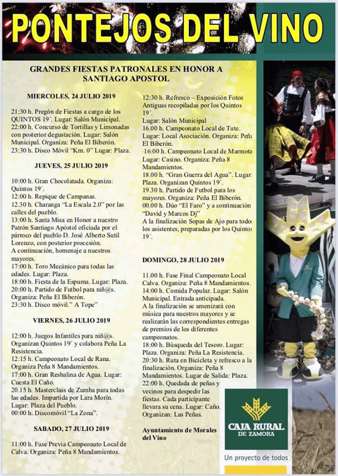 La localidad zamorana de Pontejos del Vino ya está preparada para disfrutar de las grandes fiestas patronales en honor a Santiago Apóstol. Consulta el PROGRAMA DE FIESTAS que te ofrecemos a continuación: