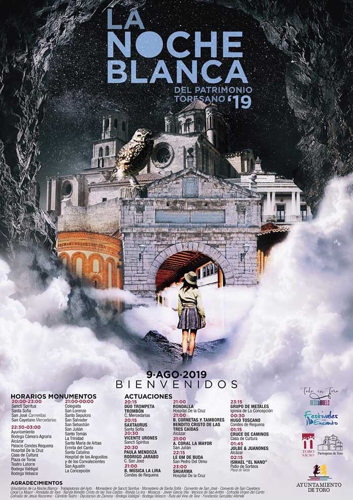 Toro prepara para este viernes 9 una noche cultural muy especial, La Noche Blanca. Una oportunidad única para visitar de noche los principales monumentos de Toro, sus iglesias y algunas bodegas. Además, esta mágica noche estará amenizada por la actuación, en diversos puntos de la ciudad, de todo tipo de formaciones musicales para todos los gustos.
