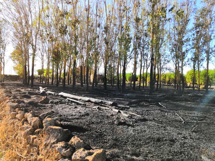 Aunque los agentes de la Guardia Civil consiguieron cortar el avance de las llamas por el resto de perímetro, no pudieron evitar que alcanzaran una chopera cercana, una plantación de pinos, tierras cosechadas y una cantidad considerable de ruedas amontonadas en otra de las fincas lo que hacía que el humo desprendido por estas fuera visto desde muchos kilómetros de distancia. El origen del incendio en principio se desconoce, pero todo hace indicar que fuera producto de una negligencia.